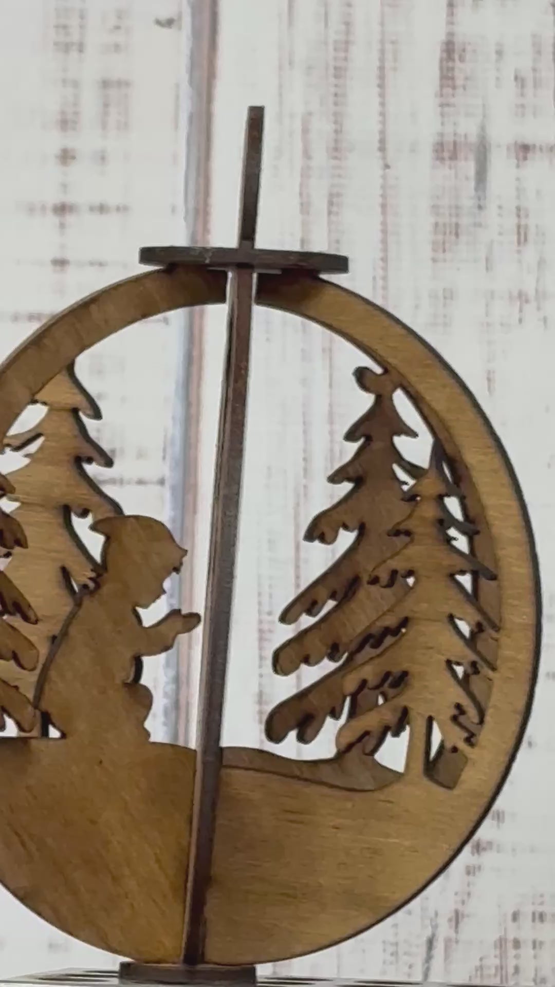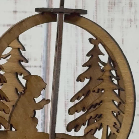 Skillfully laser-cut and thoughtfully handcrafted in our workshop, this snowman winter scene ornament showcases a refined design that adds timeless elegance to any Christmas tree.
