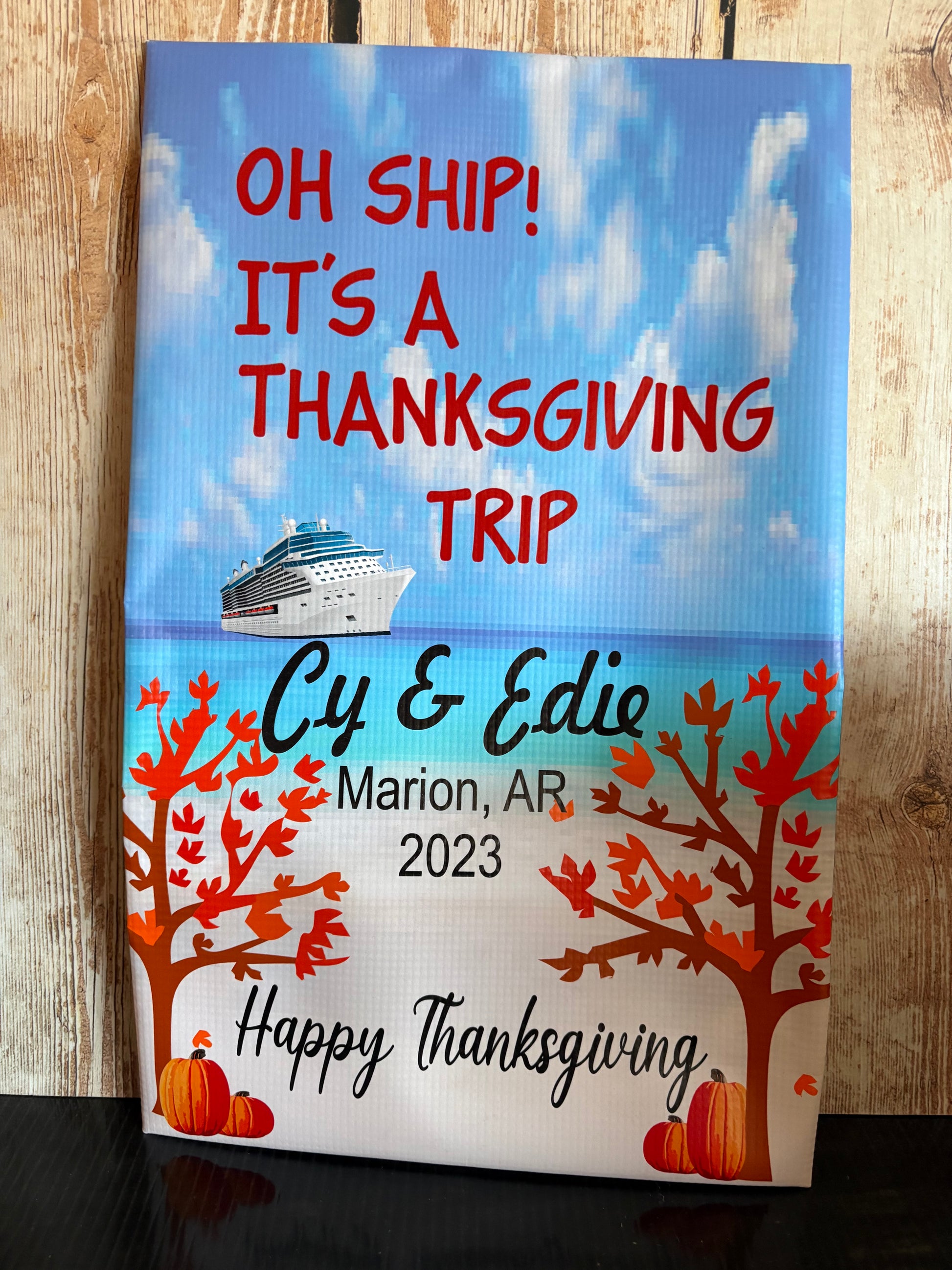 Give your cruise cabin door a personal flair with a custom banner that adds extra fun to your trip. We’ll work with you to create something playful and one-of-a-kind. They’re also super handy for finding your room after a lively night, since every door on the ship can look the same. Each banner includes two grommets for easy hanging.