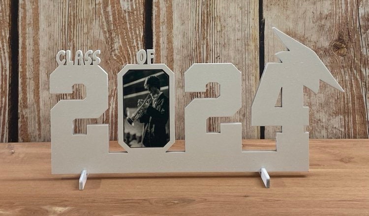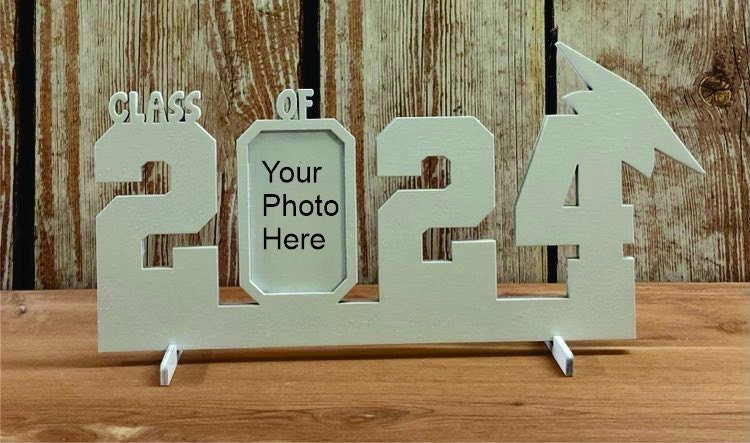 Offering a graduation year picture frame, you supply the image in electronic format, and we'll provide a frame measuring roughly 10" in length and 5" in height with the picture pre-inserted. This laser-cut frame can be painted in your color of choice, provided it's available in spray paint form. We will then transfer the image onto an MDF board using sublimation and secure it within the frame.